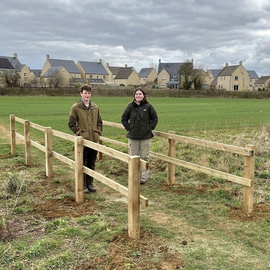 Jacob, our Apprentice Woodland Ranger and Molly, our Apprentice Conservation Ranger next to a structure they both built on the site of a beetle bank, guiding walkers to stay on the footpath to protect the beetles (Milton Farm, Gloucestershire)