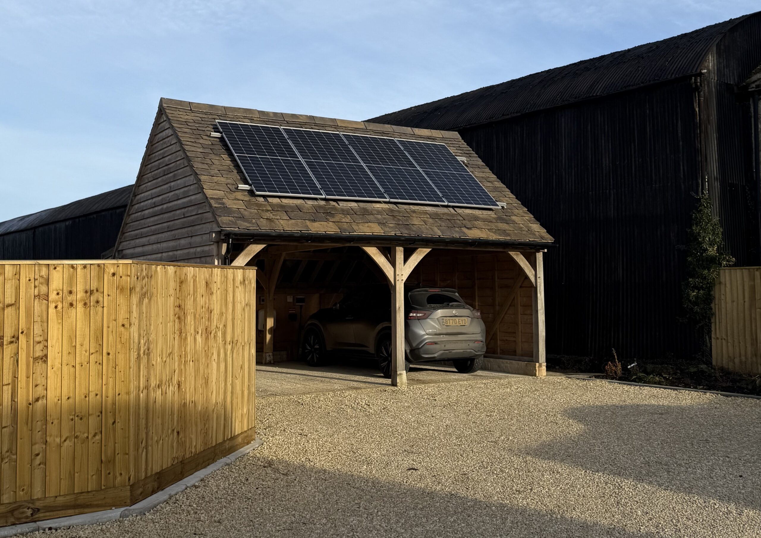 Car ports featuring roof-mounted solar panels helped Fiennes Court achieve the highest energy efficient standards